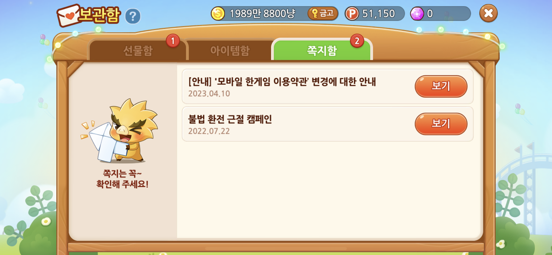게임 혹은 이벤트를 통해 받은 선물이 보관되는 곳입니다. 받기를 눌러 보상을 수령하실 수 있습니다.