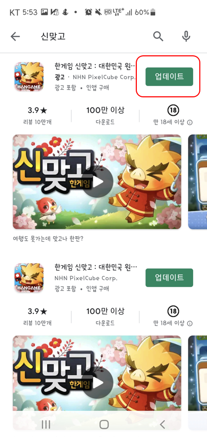 3. 목록에 한게임 신맞고 업데이트 버튼을 누른다.